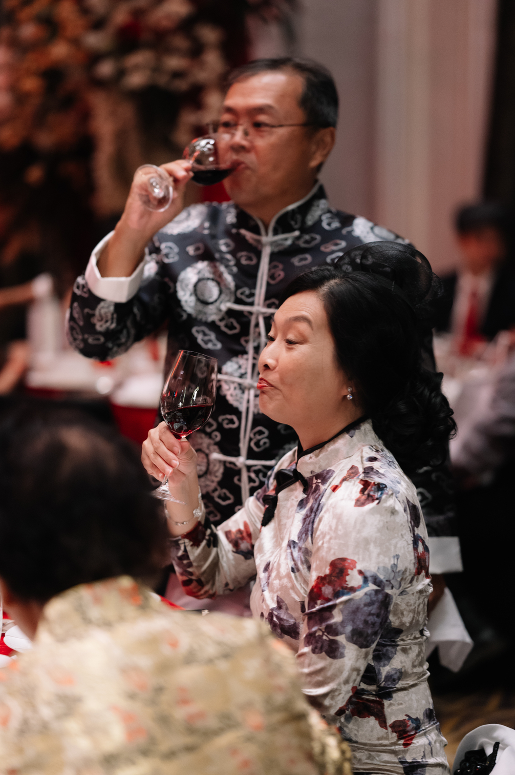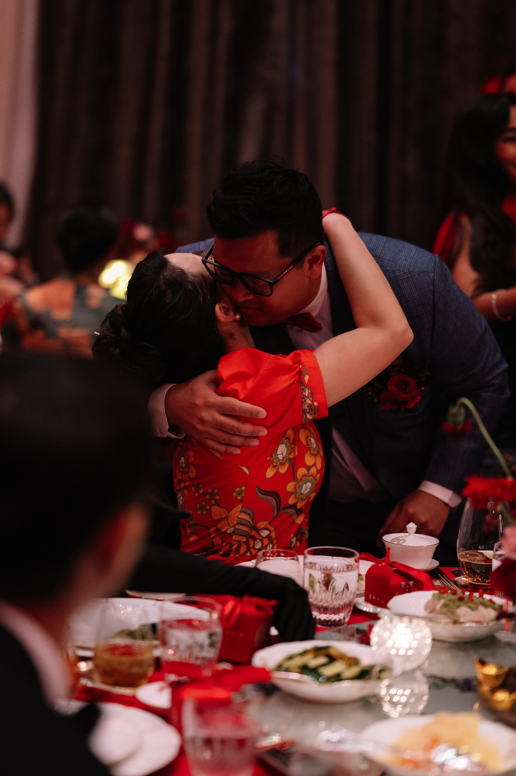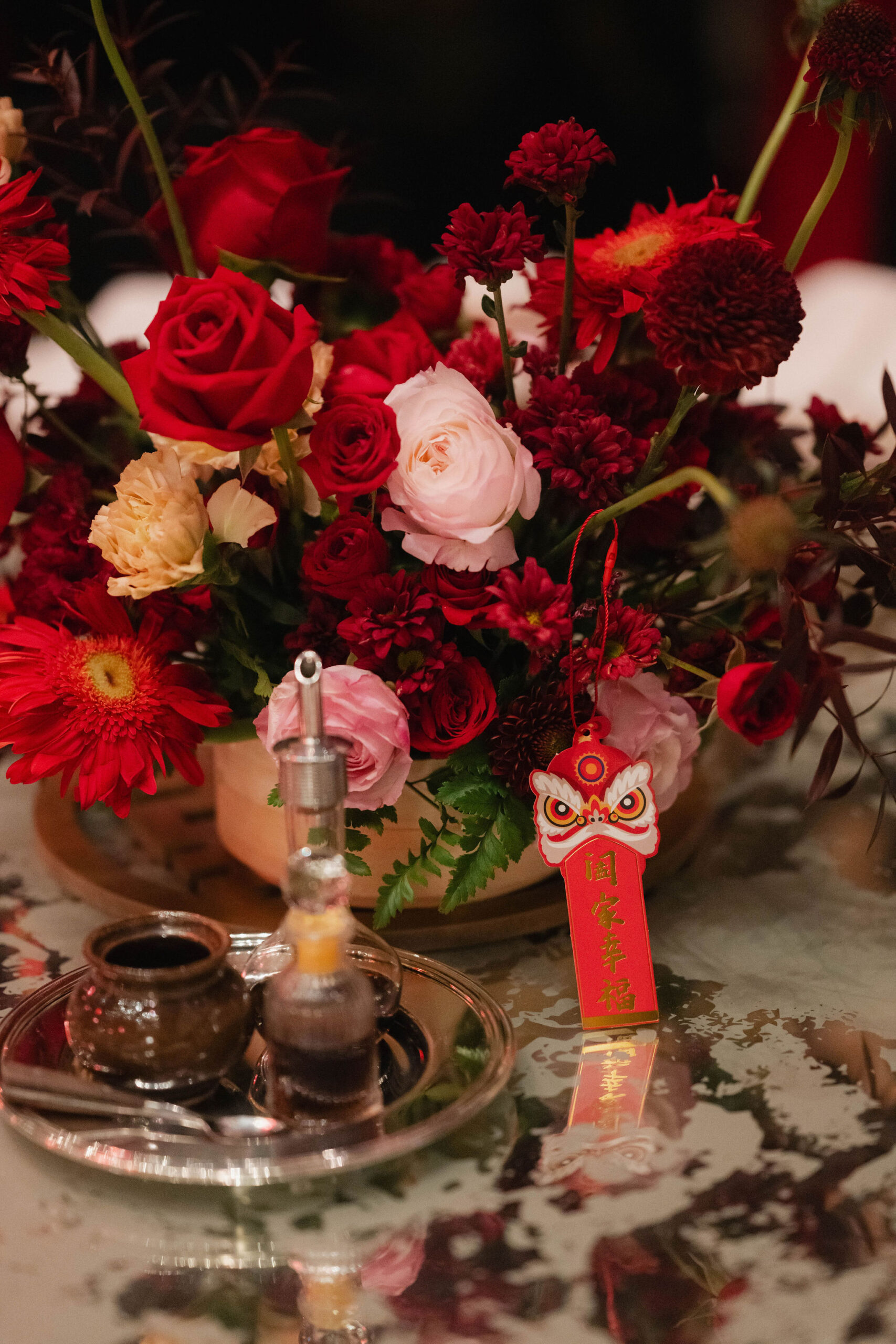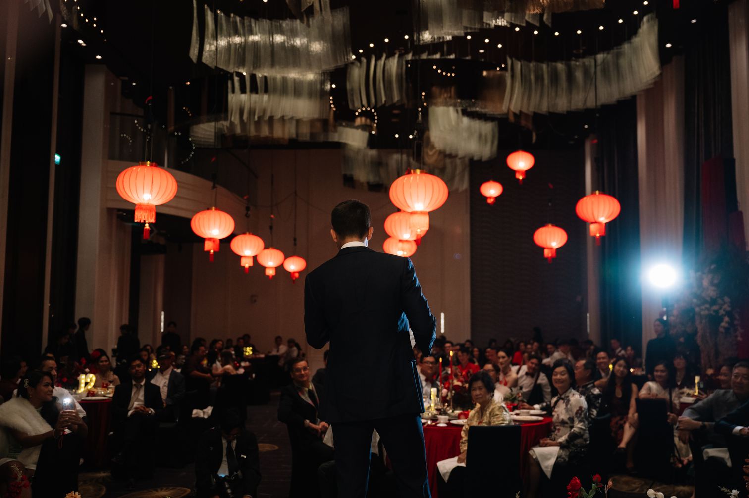 Dinner began with a Chinese banquet wedding menu served family style to encourage shared enjoyment and warmth. Each dish was thoughtfully selected—honoring heritage, crafted with intention, and brought out in a rhythm that allowed guests to truly savor the experience. Between courses, toasts echoed through the room, culminating in a spirited Yamseng toast not just any toast, but one done “on top of the lung,” a boisterous, joy-filled Malaysian tradition that brought every guest to full voice. It was celebratory, loud, and deeply honoring of the groom’s cultural roots.
