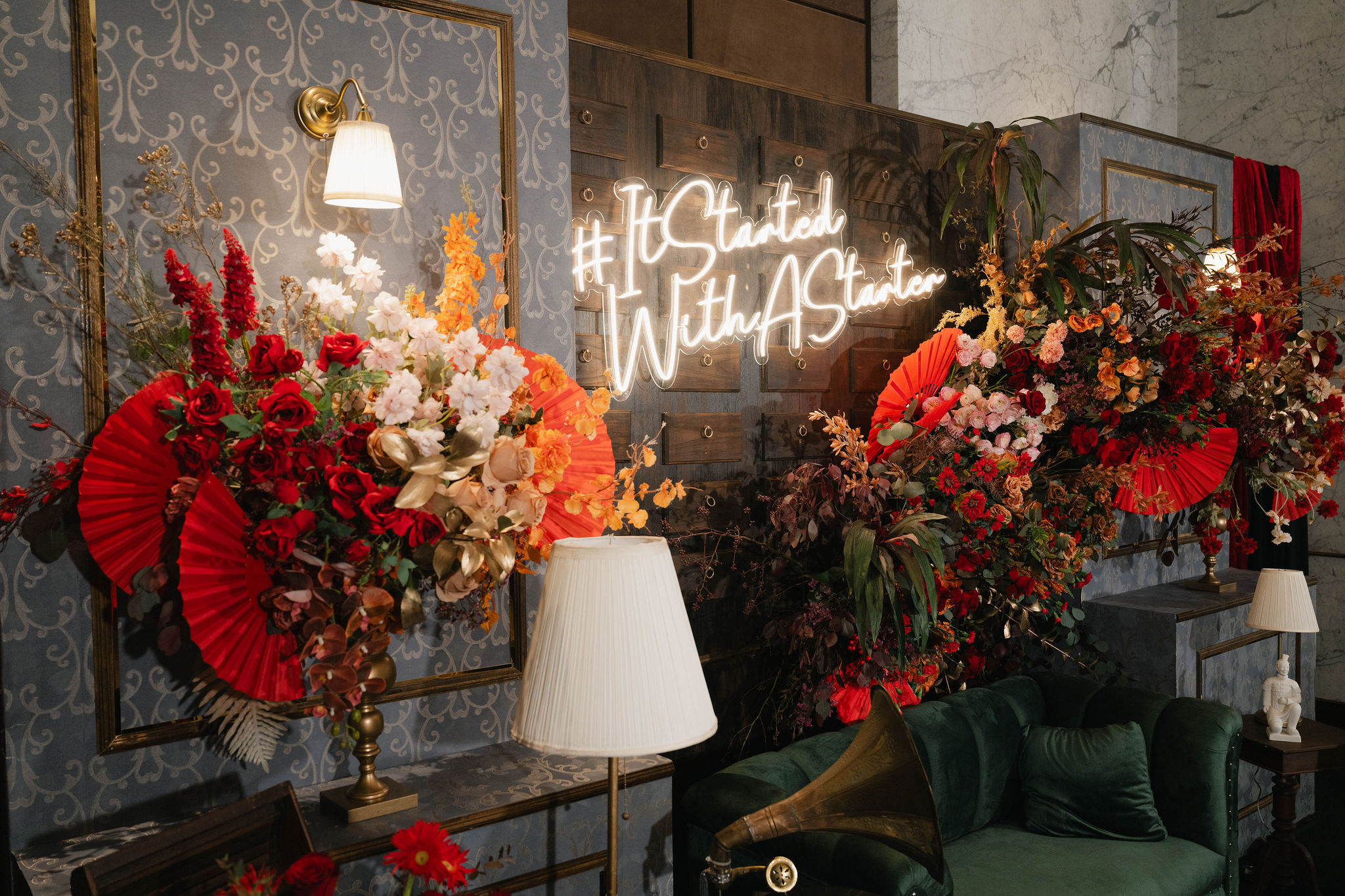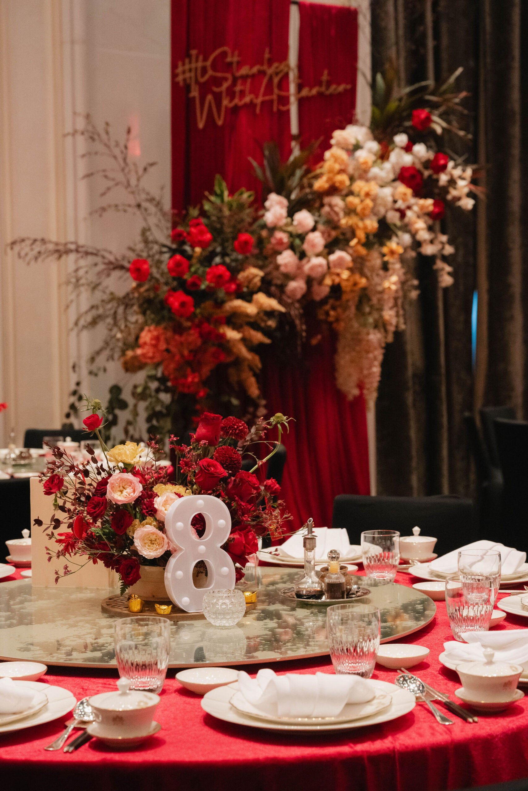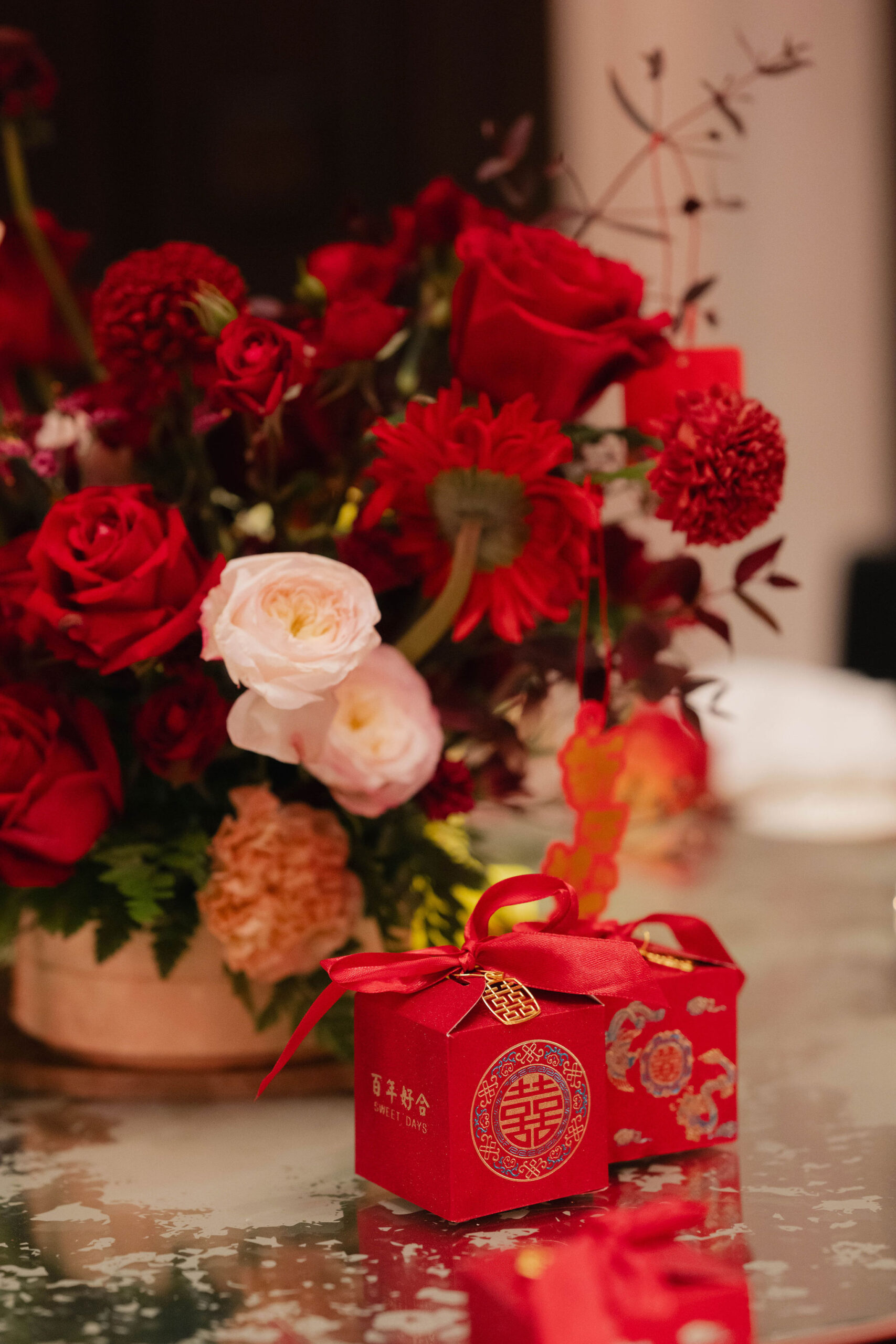 We transformed the high-ceilinged ballroom at Rosewood Bangkok into a cinematic dream. Red florals cascaded through space alongside soft feather fans and lanterns that swayed above tables, while an orange tree seating chart offered a whimsical yet culturally rooted welcome. Guests embraced the brief, arriving in character with qipaos, tailored suits, bold lips, suspenders, and fedoras. The energy was playful, elegant, and immersive, everything you could ask for in a modern city wedding.