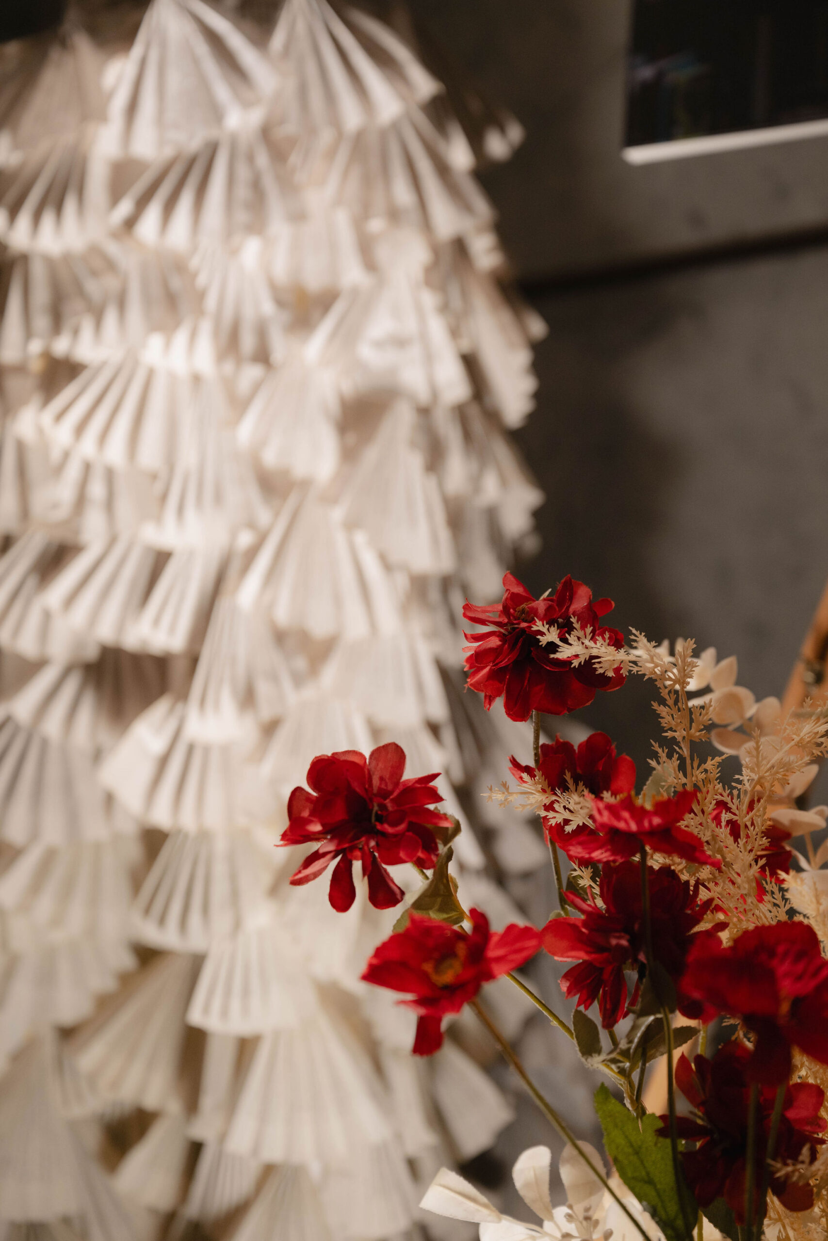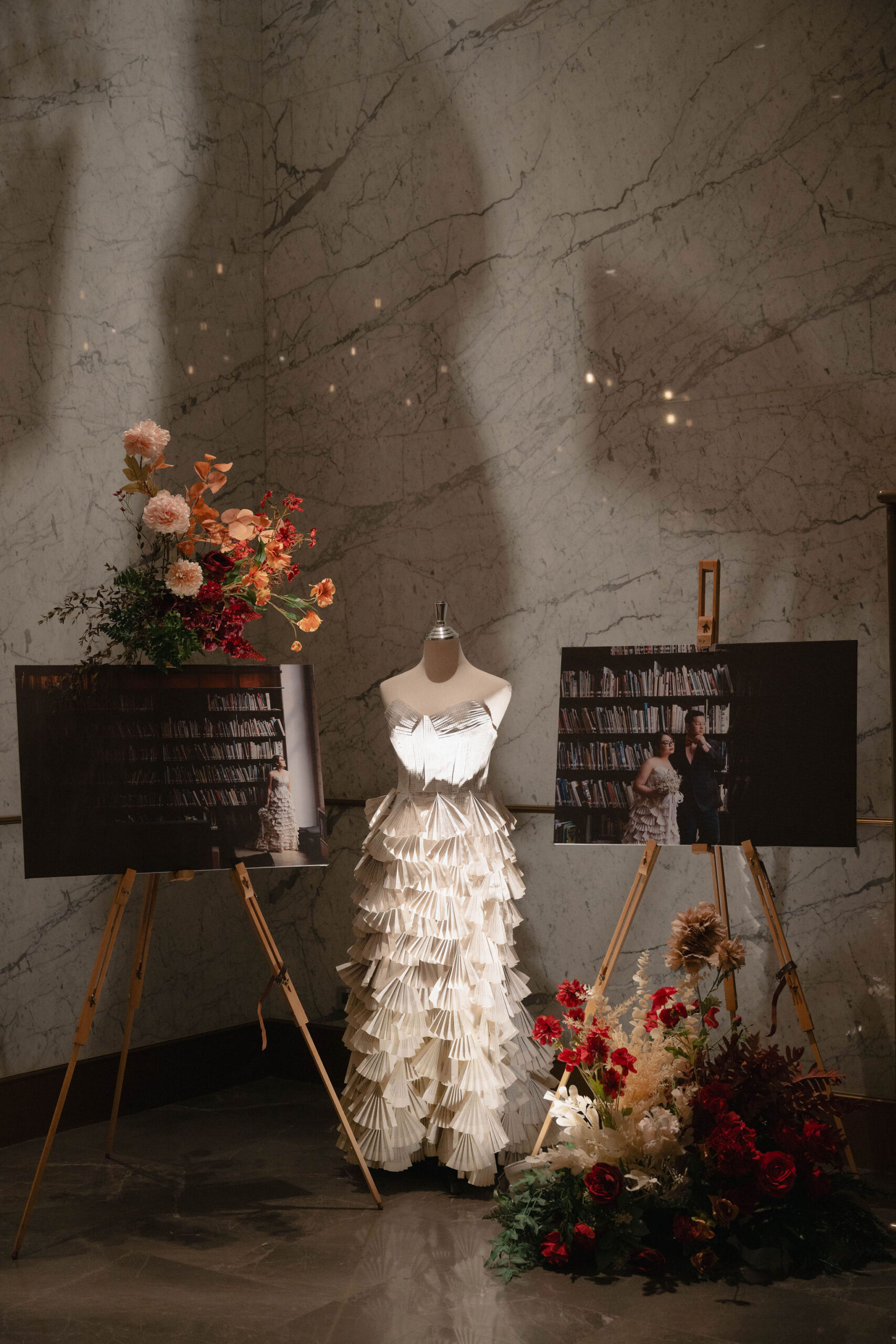 Crafted with inspiration from her favorite book, this dress wasn’t just a garment; it was a piece of her personal artistry, made entirely by hand before the wedding. Set against a clean, museum-like corner of the gallery, the piece became a conversation starter and a testament to self-expression, creativity, and the layers that make up a love story.
