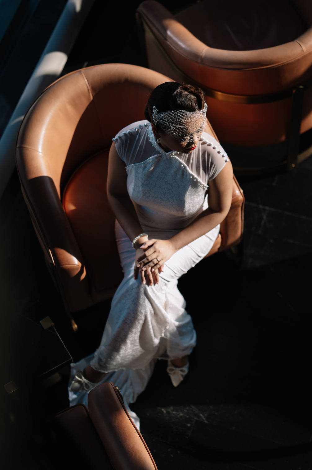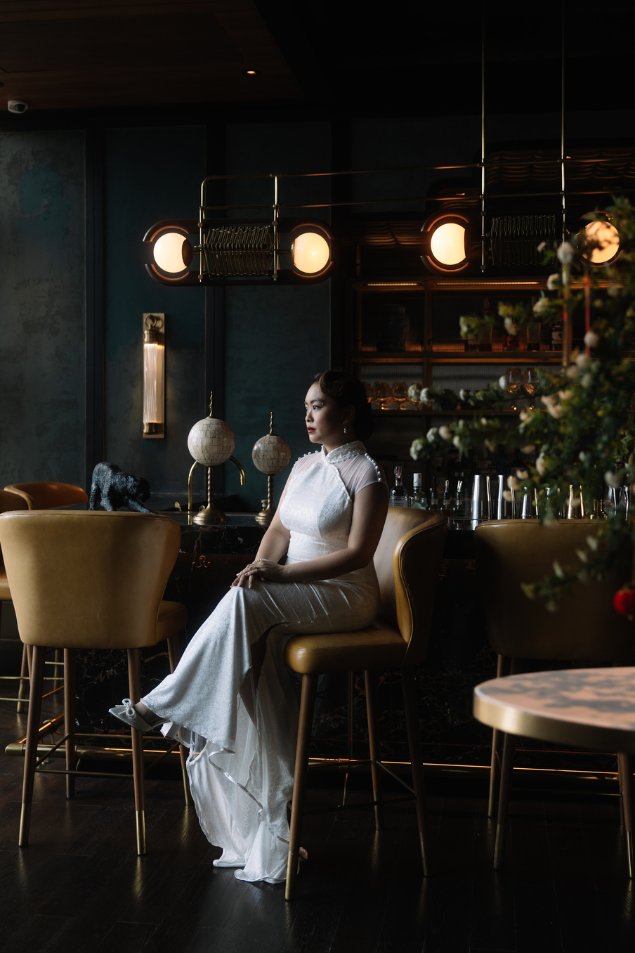 They used Rosewood Bangkok’s signature restaurants Lennon’s and Nan Bei as the backdrop for their private couple shoot turning these familiar settings into unexpected sanctuaries. At Lennon’s, the rooftop bar evoked a vintage jazz lounge vibe, letting their glam wardrobe come alive against deep wood textures, moody lighting, and vinyl records. Downstairs at Nan Bei, inspired by the tale of the Weaver Girl and the Cowherd, they embraced the mirrored walls and dramatic lighting that spoke perfectly to their East meets West theme.