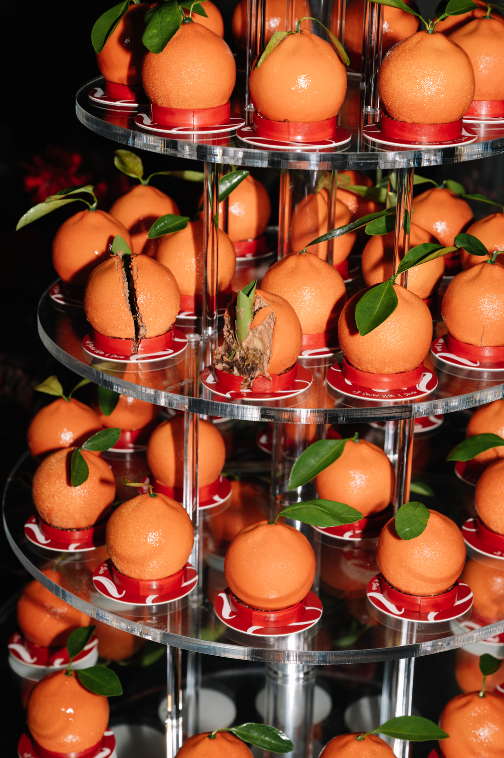 For dessert, guests were treated to individual orange-shaped cakes glazed to perfection and displayed like delicate sculptures before being served. A touch of whimsy with a story mirroring the orange tree they had seen upon arrival.