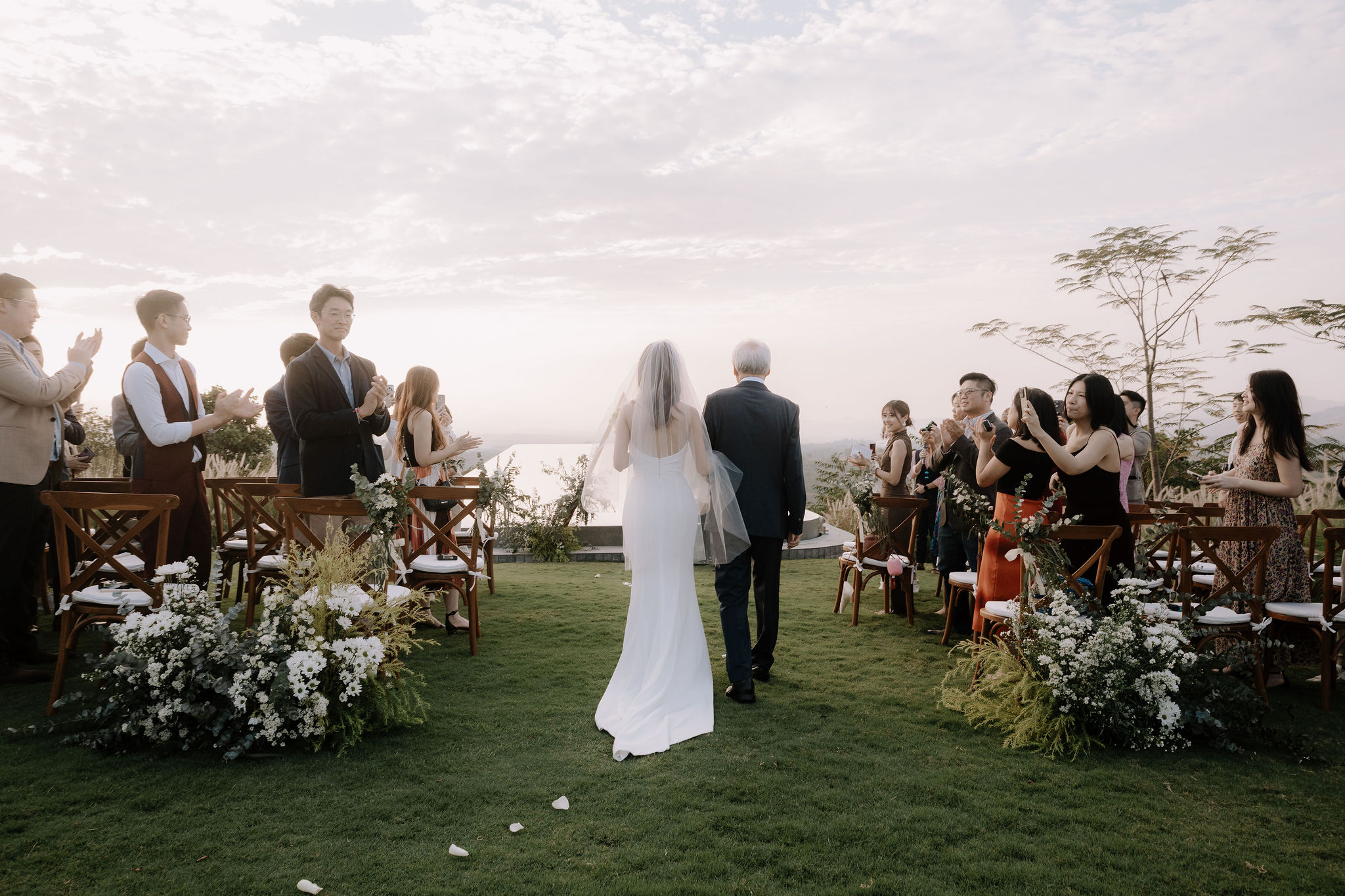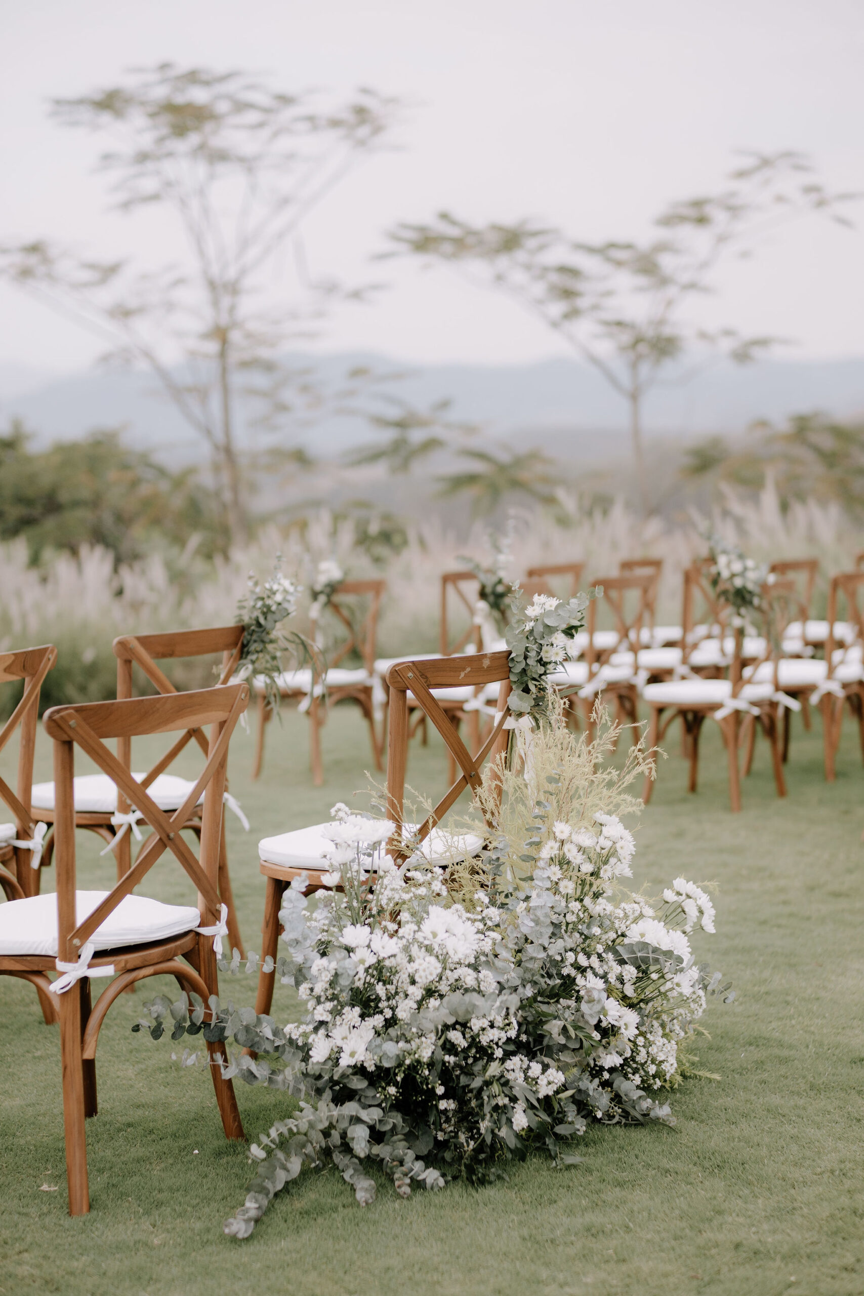 On the spacious lawn by Sala’s main pool, the ceremony embraced a natural, timeless aesthetic. Our design vision was rooted in simplicity—an elevated softness that complemented rather than competed with the surrounding beauty of this Khao Yai wedding venue.
