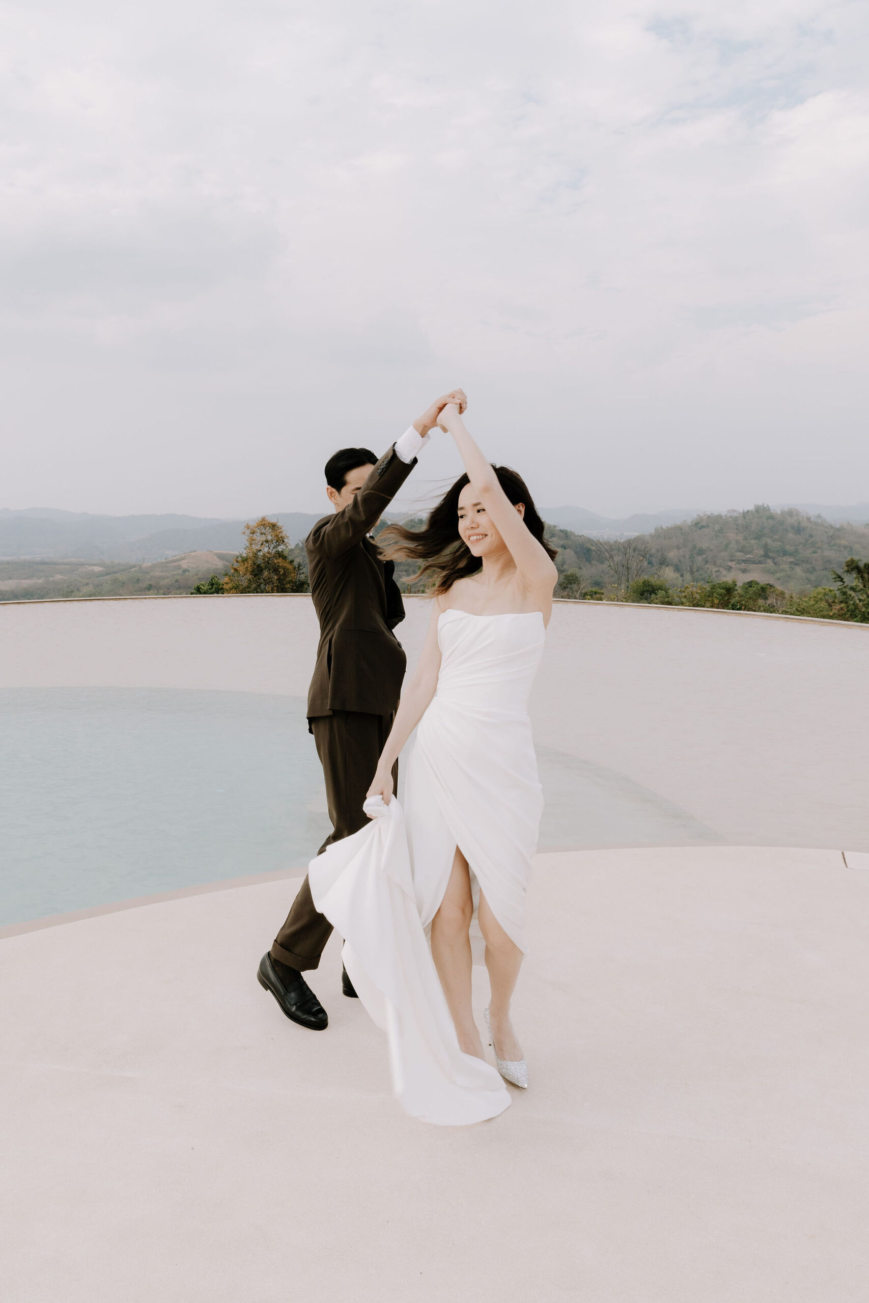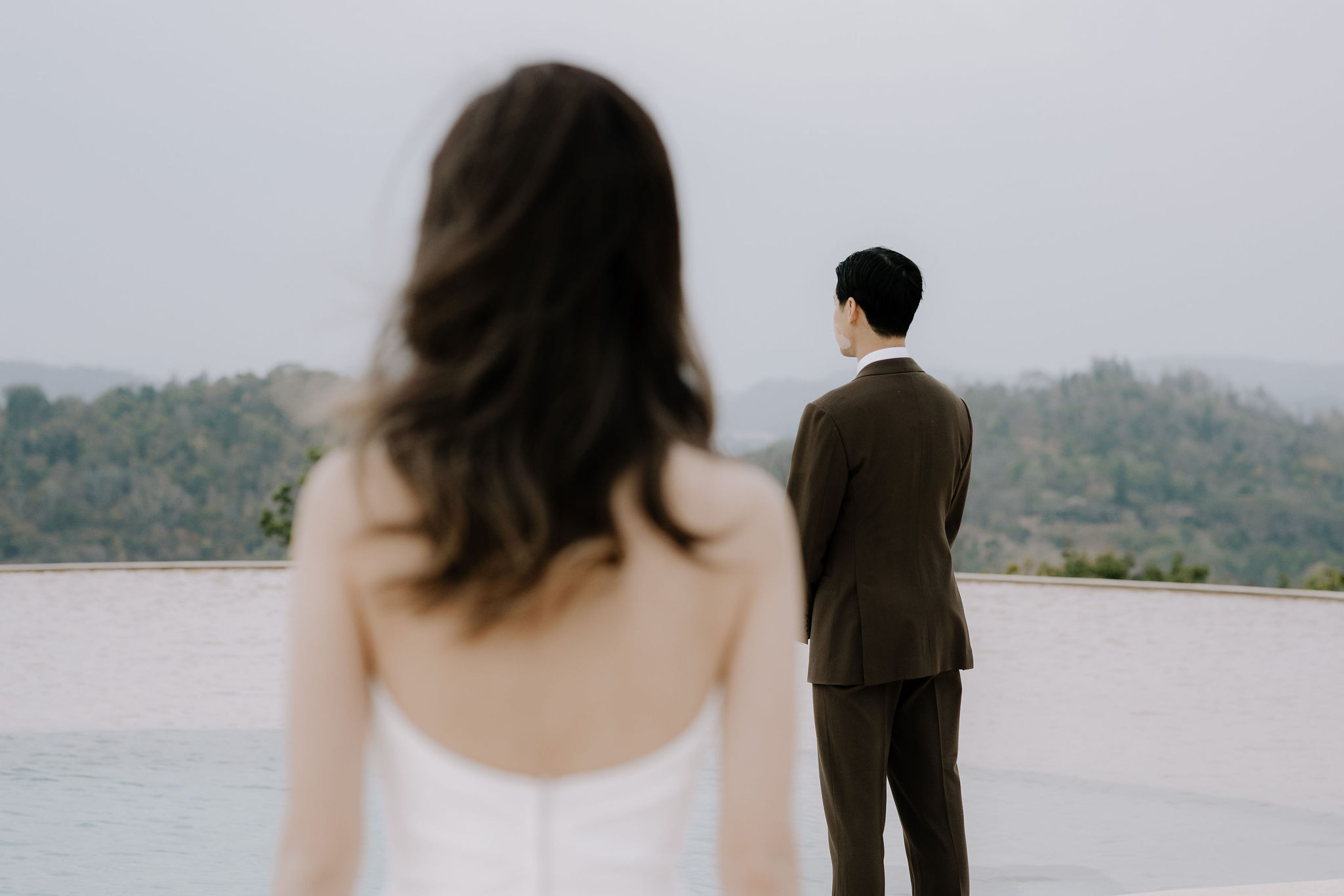Here, in the heart of the mountains, the setting took on an unexpected tone. The clean-lined rooftop, with blue water shimmering beneath their feet, created an atmosphere reminiscent of a seaside escape—bringing a playful contrast to what is usually expected from an outdoor wedding in Khao Yai.